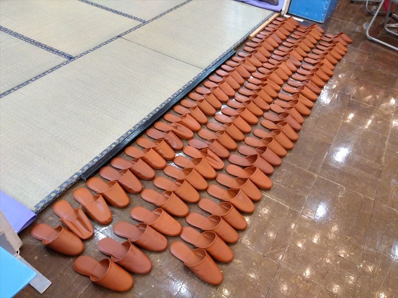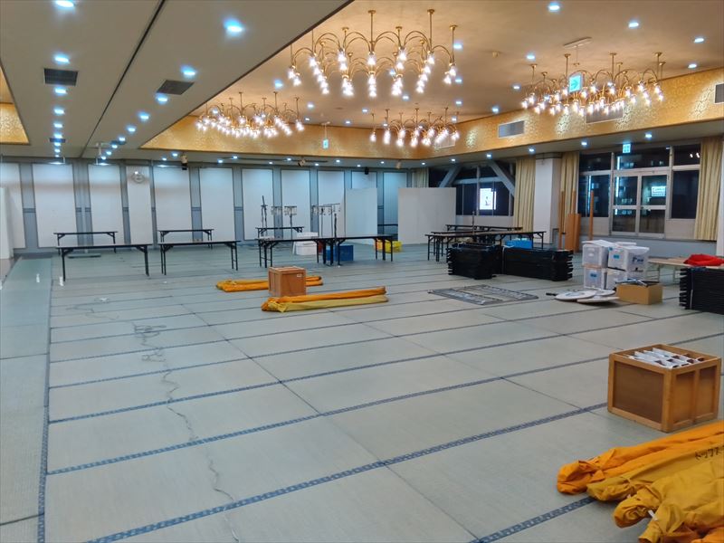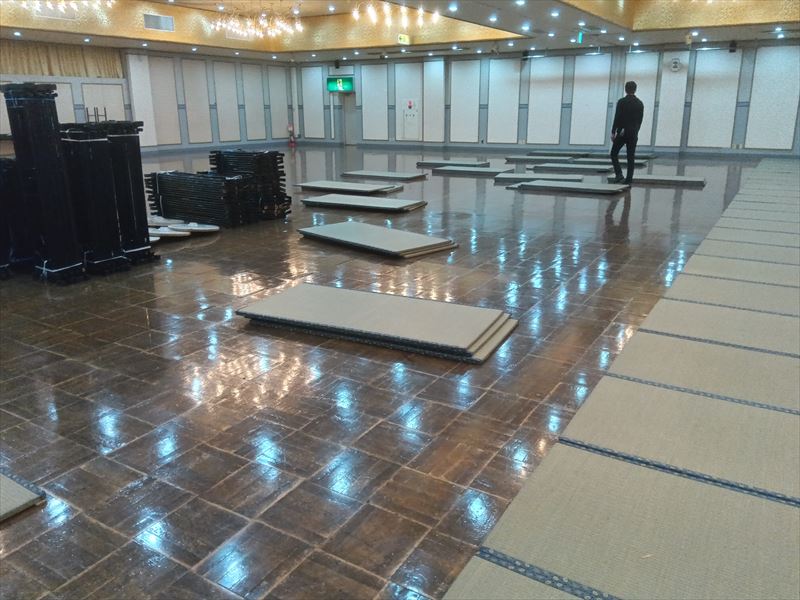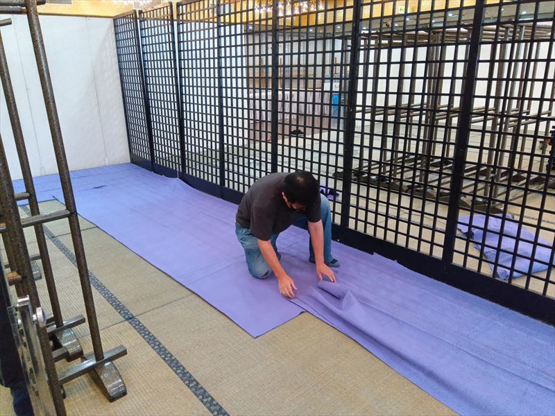 今回は畳敷きの特設会場となるため、下地のズレや段差が出ないよう細心の注意を払いながら作業をおこなっていきます!一枚一枚の畳を丁寧に運び込み、配置を確認しながら敷き詰めていく工程は時間も体力も必要ですが、ここが仕上がりを左右する重要なポイントです!広い会場だからこそ、最初の基礎作りを妥協せず行うことが、後工程をスムーズに進める鍵になると改めて実感しました!