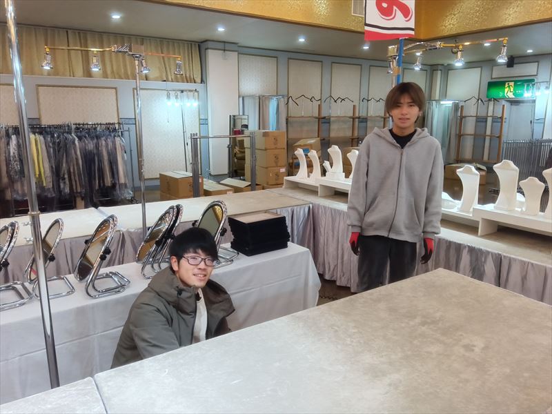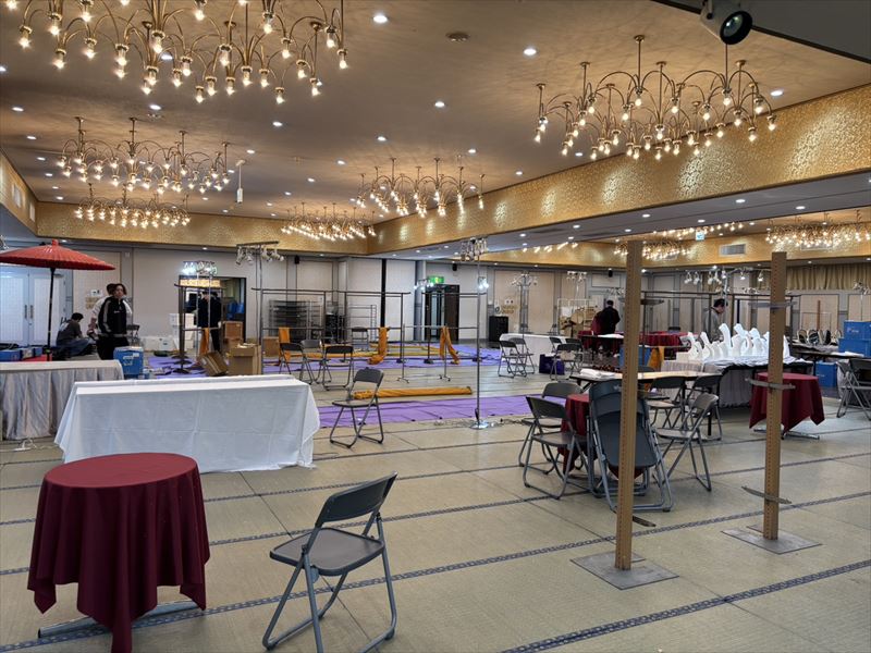 呉服が美しく映える高さや間隔を意識しながら設営を行い、照明とのバランスも確認しました!実際に展示された状態を想定しながら配置を整えることで、来場者が自然と足を止めたくなる空間作りを目指しました!ここまでくると、会場全体の雰囲気が一気に華やいでいくのを感じます!