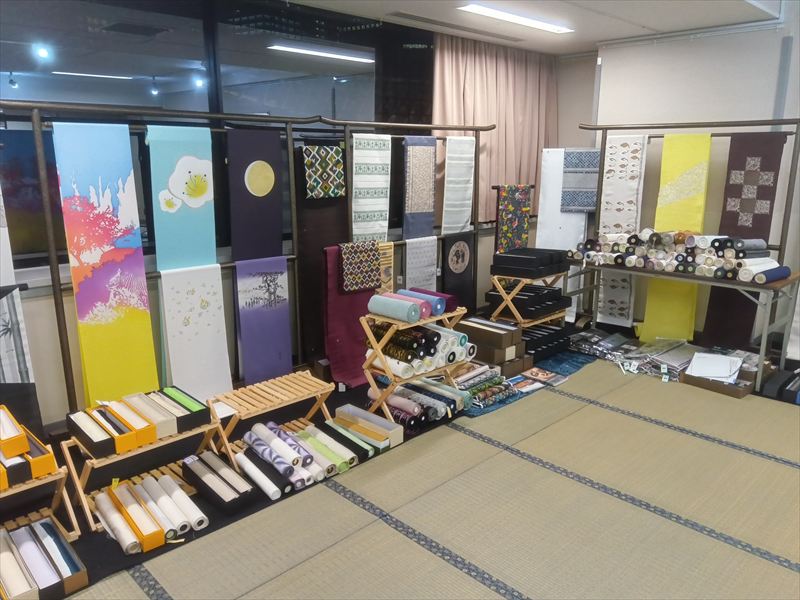 畳を敷き詰めた和の空間をベースに、反物ラックや展示什器をバランスよく配置し、来場者が自然な流れで会場内を回遊できるよう動線を設計しています!