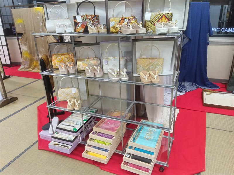 反物や帯をただ並べるのではなく、置き方や高さ、間隔まで考えられており、呉服がとても綺麗に映えていました!