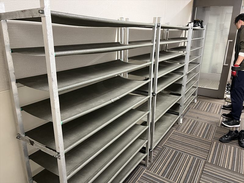 畳の設営が完了すると、続いて呉服を美しく魅せるための什器や反物ラックを設置していきました!
