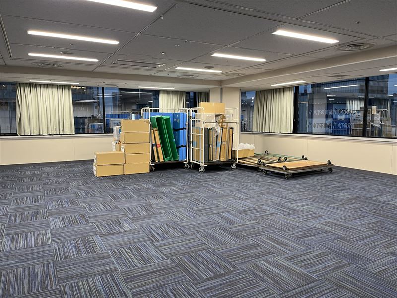 広い会場とはいえ、一気に資材が入ると足の踏み場がなくなるため、常に整理整頓を意識しながら搬入を進めている現場でした!