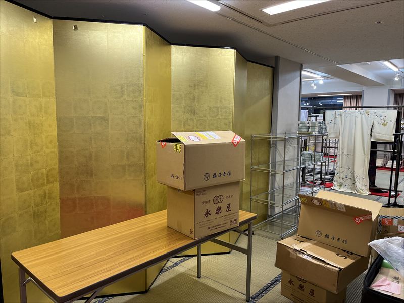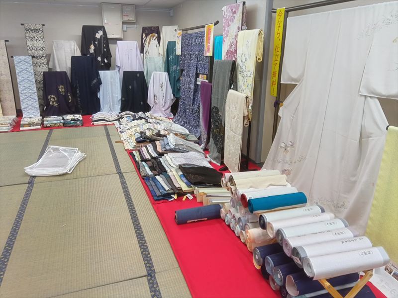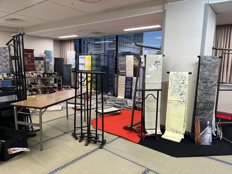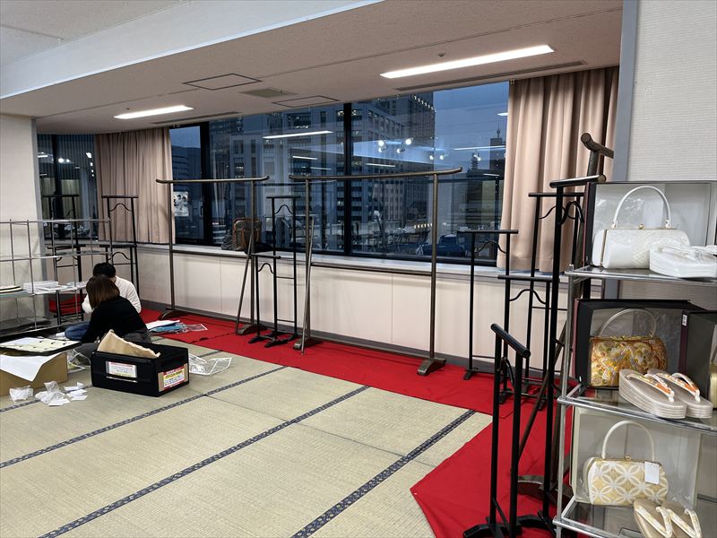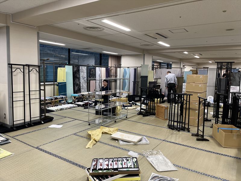 畳が敷かれることで、無機質だった会場が一気に和の雰囲気に変わり、呉服イベントらしい空間が少しずつ完成していく様子が印象的でした!