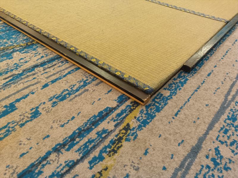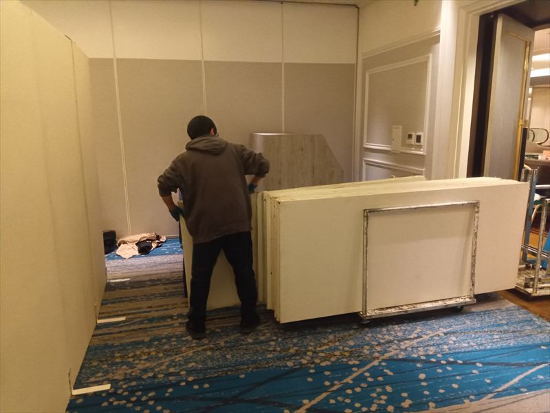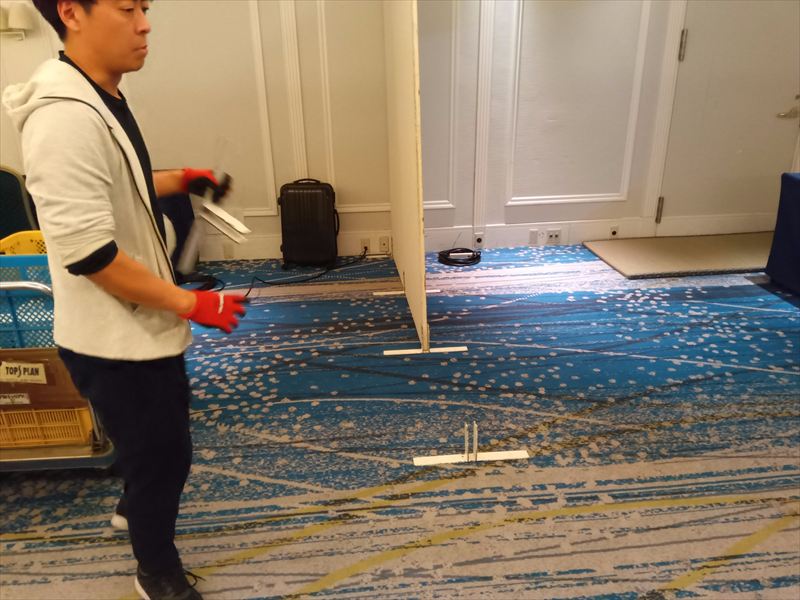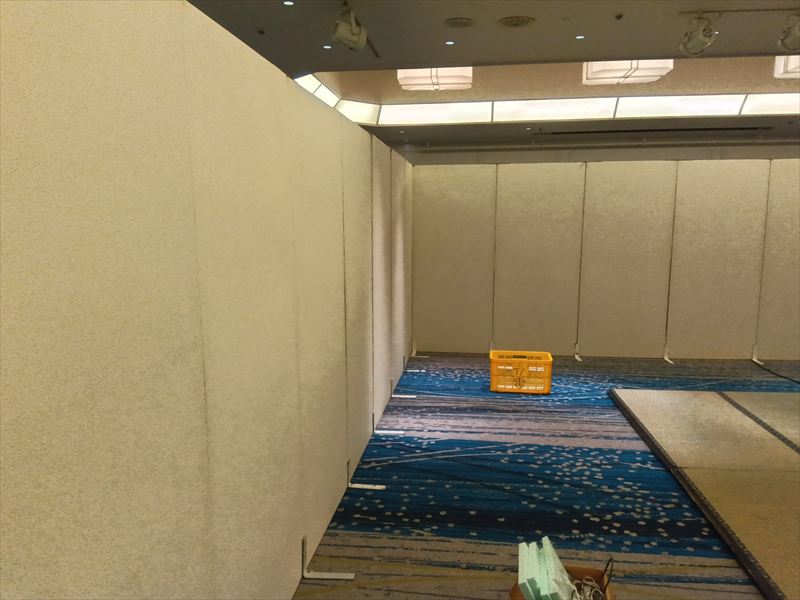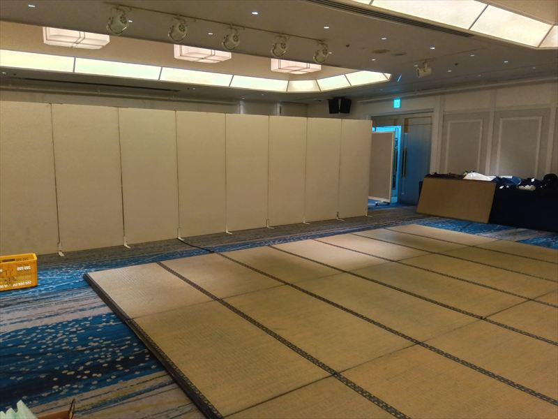 今回の呉服展示会場づくりは、まずホテル会場の洋風絨毯の上に畳を設置する工程から始まりました!
