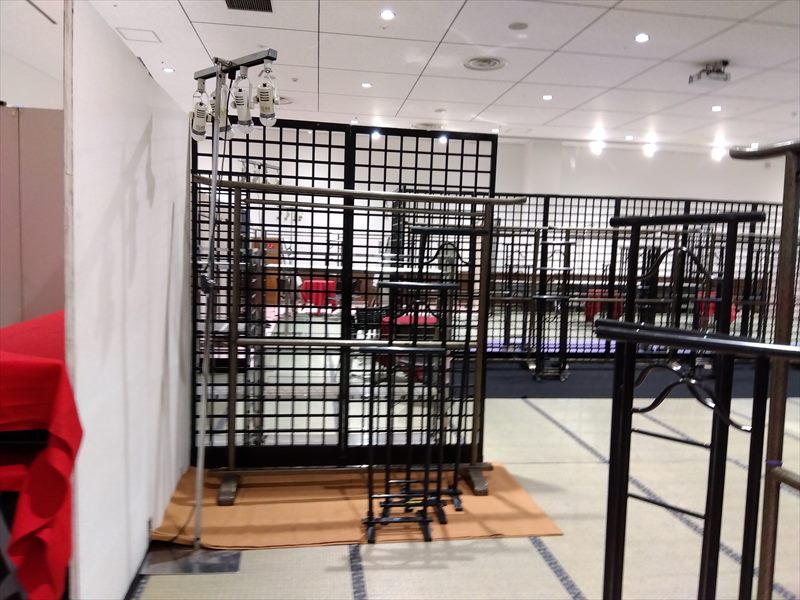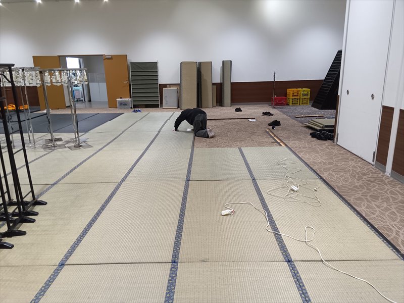 まずは、会場内の着物を展示するメインスペースに畳を丁寧に敷き詰めていきます!今回は一般的な畳に加え、黒色の畳を組み合わせて使用しました!色のコントラストを活かすことで、視覚的に空間へメリハリが生まれ、間仕切りを設けなくても自然とエリア分けができるレイアウトになっています!