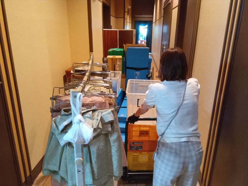 ホテル内の細い廊下を通って搬入する必要があり、壁やドア枠に什器をぶつけないよう細心の注意を払って運びました!