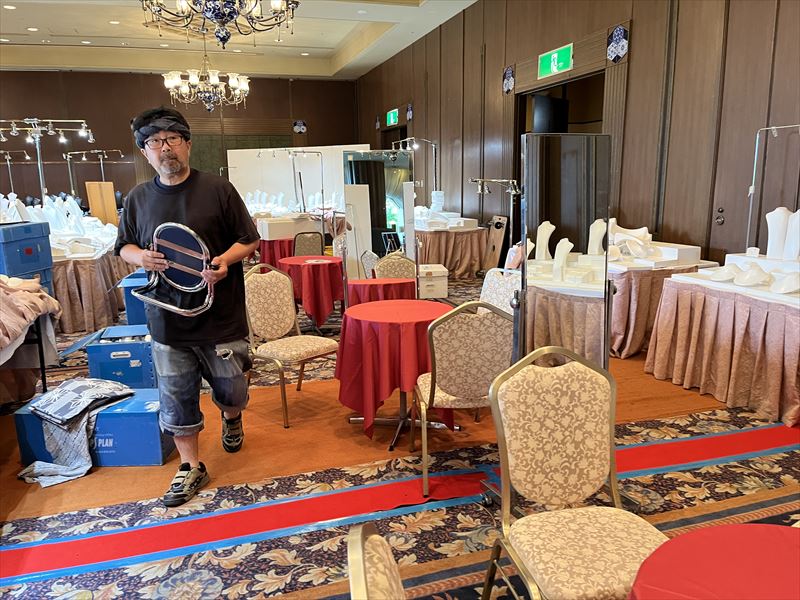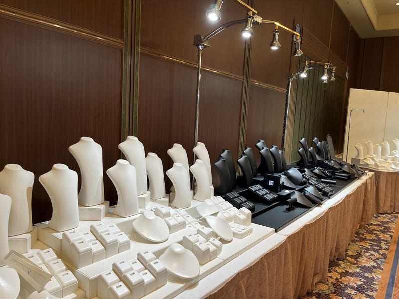 今回の展示会は、岩手県岩手郡のホテルの一角を使用し、落ち着きのある空間を“宝石が映える上質な展示会場”へと仕上げました!ホテル特有の柔らかな照明や高級感ある内装をそのまま活かしつつ、商品の魅力がさらに引き立つよう什器の配置と光の演出にこだわって設営を進めました!