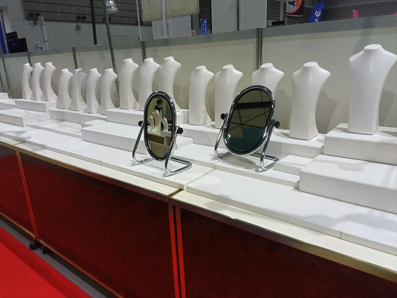 宝石展示では、宝飾ケースやディスプレイセット、スタンド式スポットライトの位置が重要です!照明の向きや角度を事前に調整しておくと、宝石の輝きを最大限に引き出せます!また、接客盆や卓上ミラーを併用することで、お客様が手に取りやすく、満足度の高い展示になります!