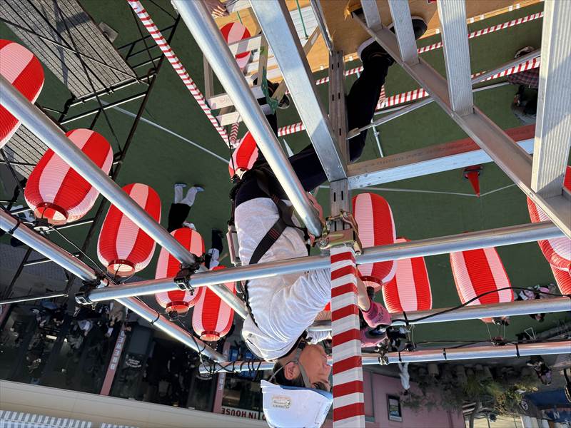 現場担当 古田より長提灯(赤白)を使用して、お祭り会場の設営を行いました!