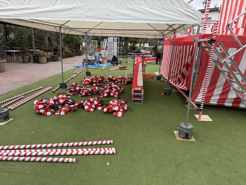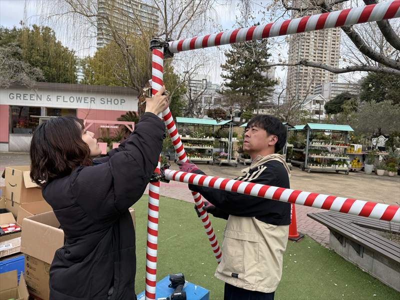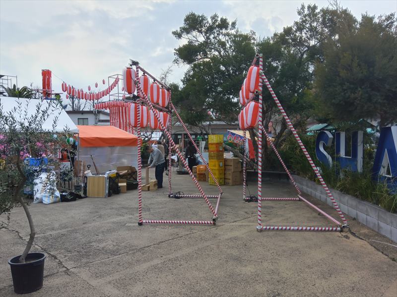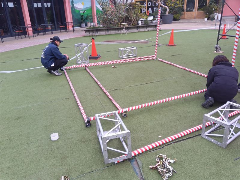 単管パイプを組み立てて、提灯を取り付けるための装飾スペースを作っていきます。これから提灯を設置していくことで、会場が一気にお祭りらしい賑やかな雰囲気へと変わっていきます!