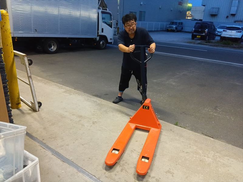 現場担当 成田より倉庫でハンドリフトを使用しました!タイヤは高品質ポリウレタンなのでとても操作しやすいです!手動でもペダルでも上げ下げが出来る仕様になっております。
