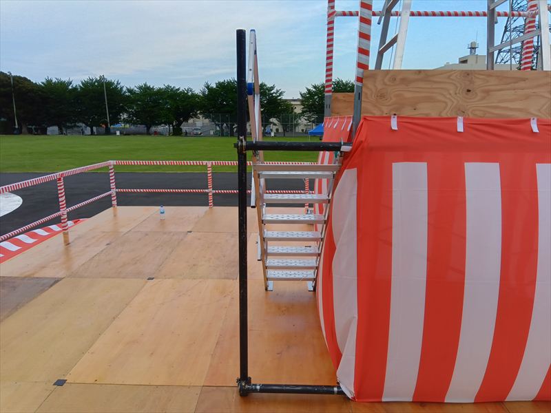 ステージへの昇降の為にステージ階段を設営したのですが、その階段に手すりを設置する為に単管1mを使用しました!