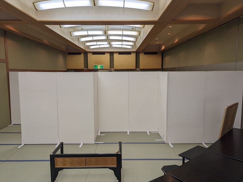 会場のエレベーターを使用できるとのことで、傷がつかないように養生シートを丁寧に貼り、会場の美観にも気を配りながら進めました! 什器の搬入が完了したあとは、畳を一枚ずつ綺麗に敷き詰め、その上に毛氈を広げ、衣桁や撞木などの什器を導線を意識しながら配置しました! また、各ブースを設けるため、会場備え付けの机もお借りし、用途に合わせて設置を行っています!