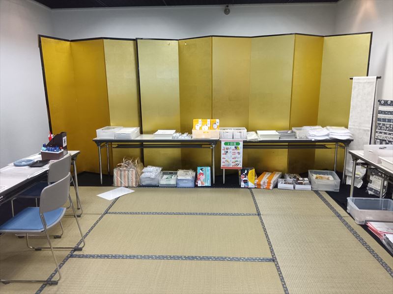 先日、その会場のひとつで、華やかな伝統美を堪能できる呉服の展示即売会が開催されました!会場は白を基調としたモダンで洗練された空間!そこにスタイロ畳を一枚一枚丁寧に敷き詰めることで、まるで和の趣が静かに息づく特別な舞台へと生まれ変わりました!さらに、畳の上に金屏風をはじめとする格式ある調度品を配置することで、ただ着物を並べるだけでは味わえない、日本ならではの優美で格調高い雰囲気が会場全体に広がっていきました!