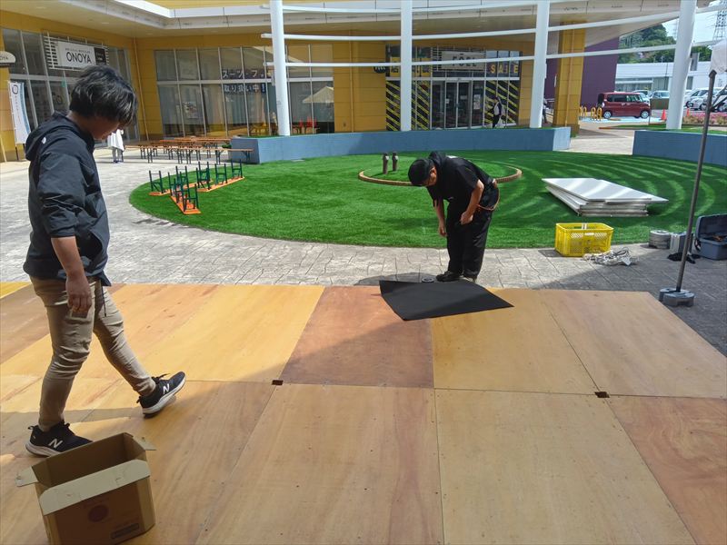 ショッピングセンターの敷地内の広場に平台を設置しました!