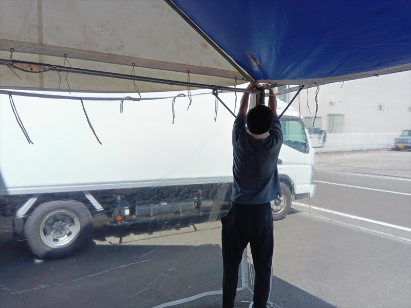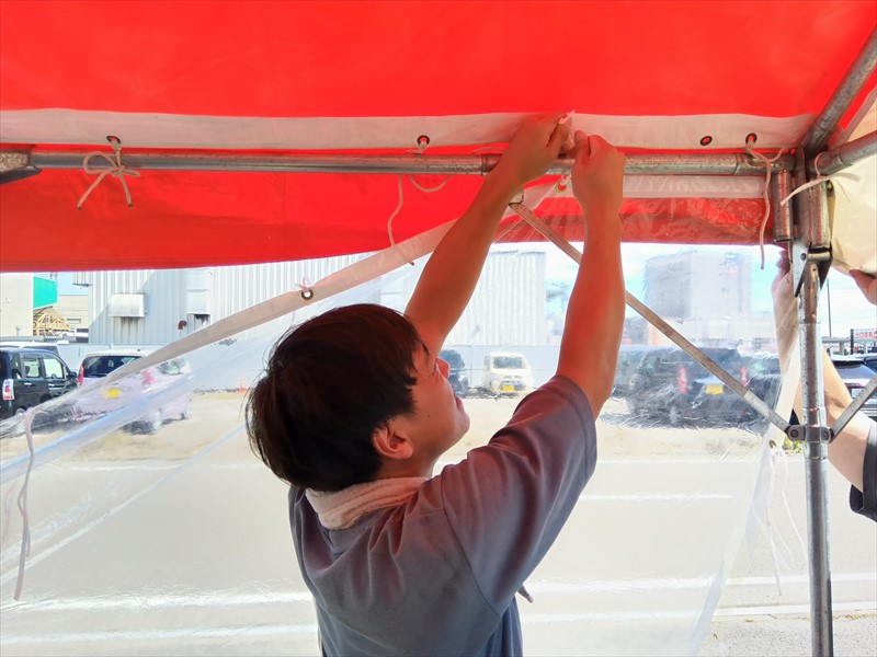 現場でテント透明横幕(2間)を取り付けた時、お客様から『中が見えるから安心できる!』とすごく喜んでいただけました!