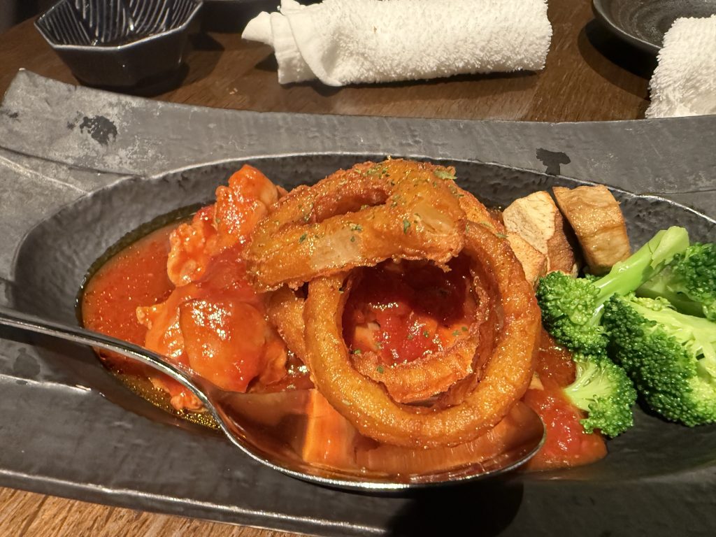 実は少し栄養に気を使っている私は、トマト煮込みが大好きです!上に載っているリングはオニオンリングかと思いきや芋のような味がして今でもあれは何だったのか気になっています!